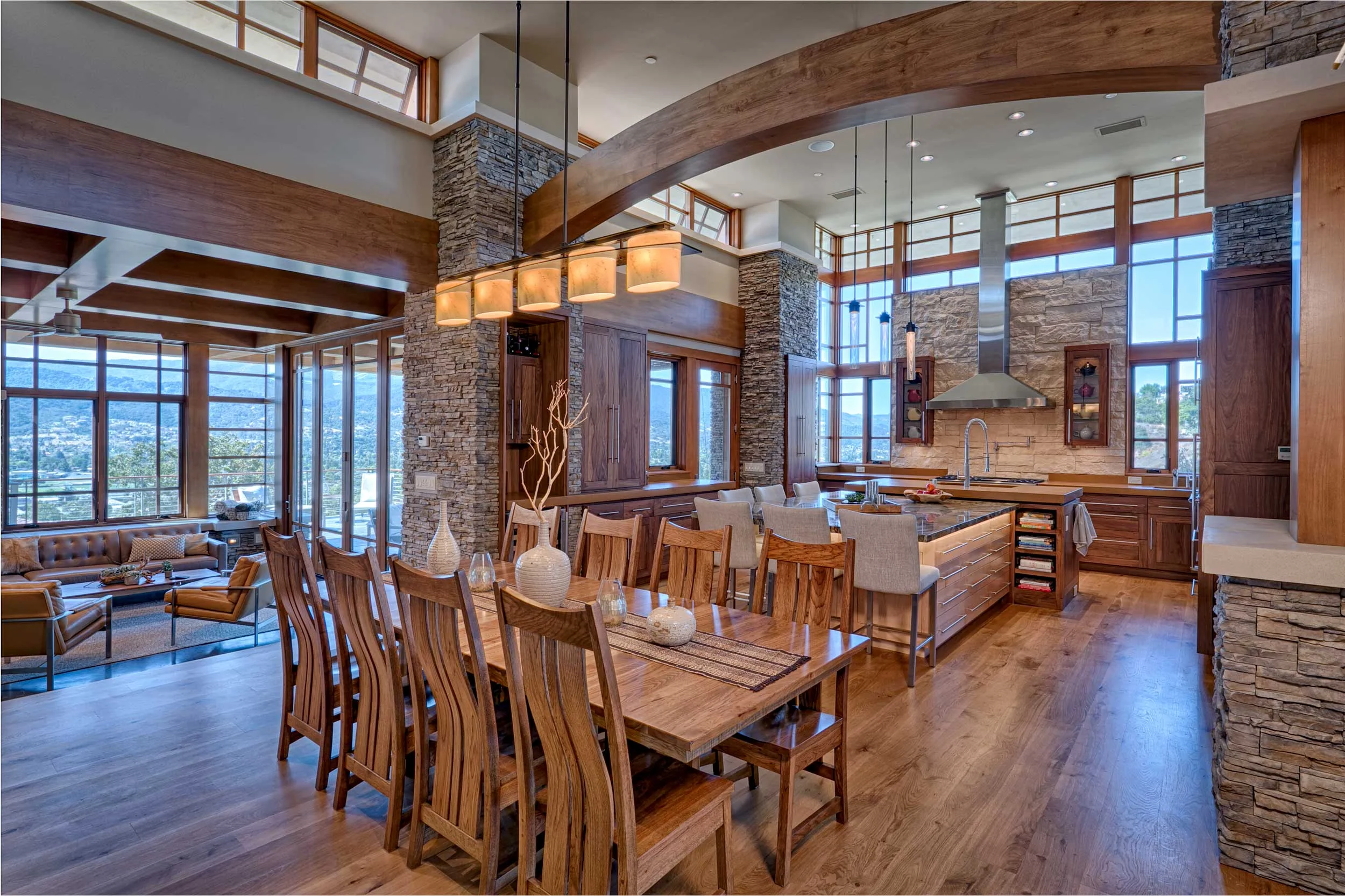 This modern, multilevel, hillside home was built with Prairie School architectural style. Its intricate, structurally detailed design is comprised primarily of concrete and steel, including large overhangs with seemingly unsupported spans. A cantilevered roof runs 15’ beyond the supporting ‘window wall’. Other features include exposed concrete flooring, two-story-high stonework passing through windows, open floor plan with 18-foot ceilings, two-story window walls, corner-less windows, an exposed wood ceiling, metal standing roof at barrel vault, and exposed metal staircases.
